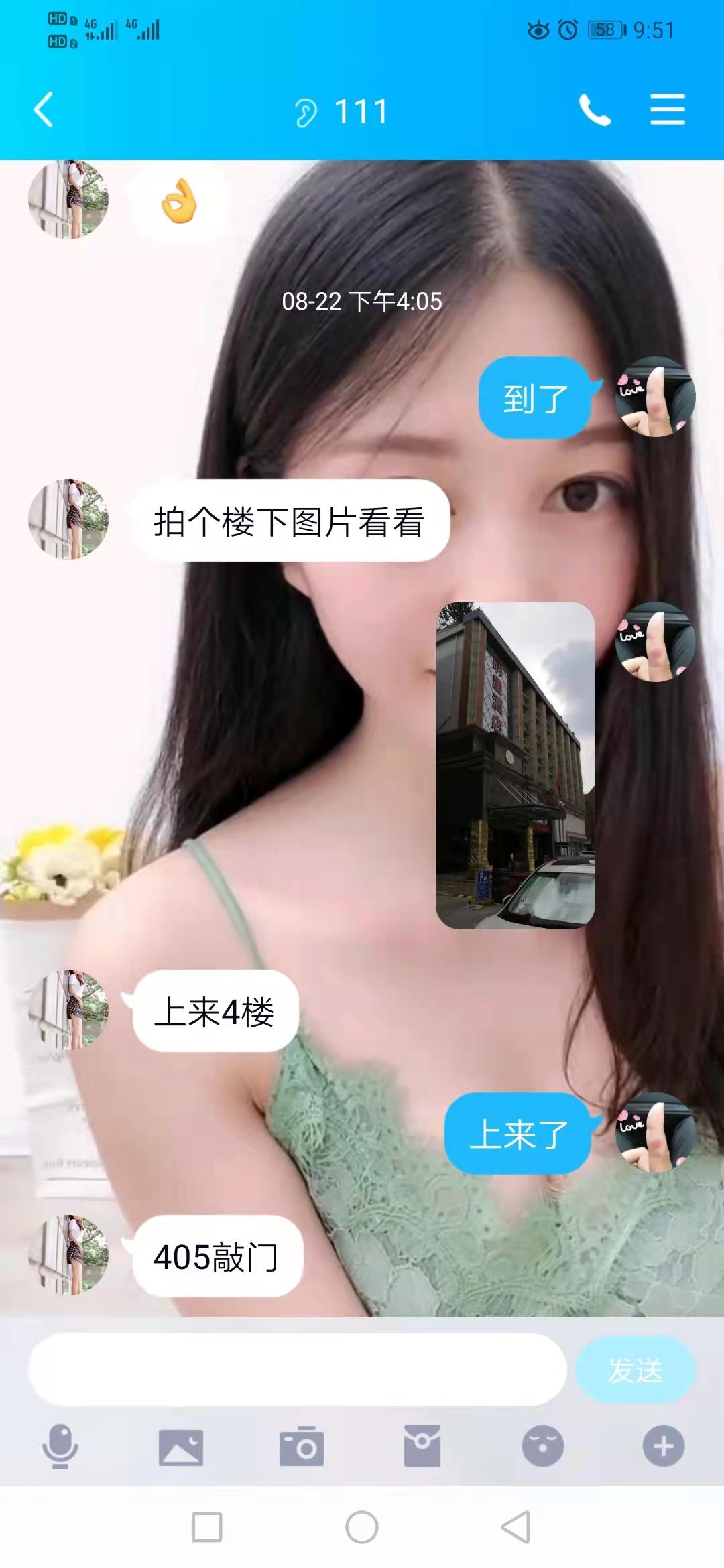 【寻欢细节】:出差在外就很无聊,附近景点这都去过了。就想找个妹妹玩玩。后来附近的人发现这妹妹。加了q之后发了位置和照片。虽然不是很漂亮但是精虫上脑那还顾得那么多。到了酒店敲开门,就看到妹妹的胸又大又挺,还有那双黑丝腿。